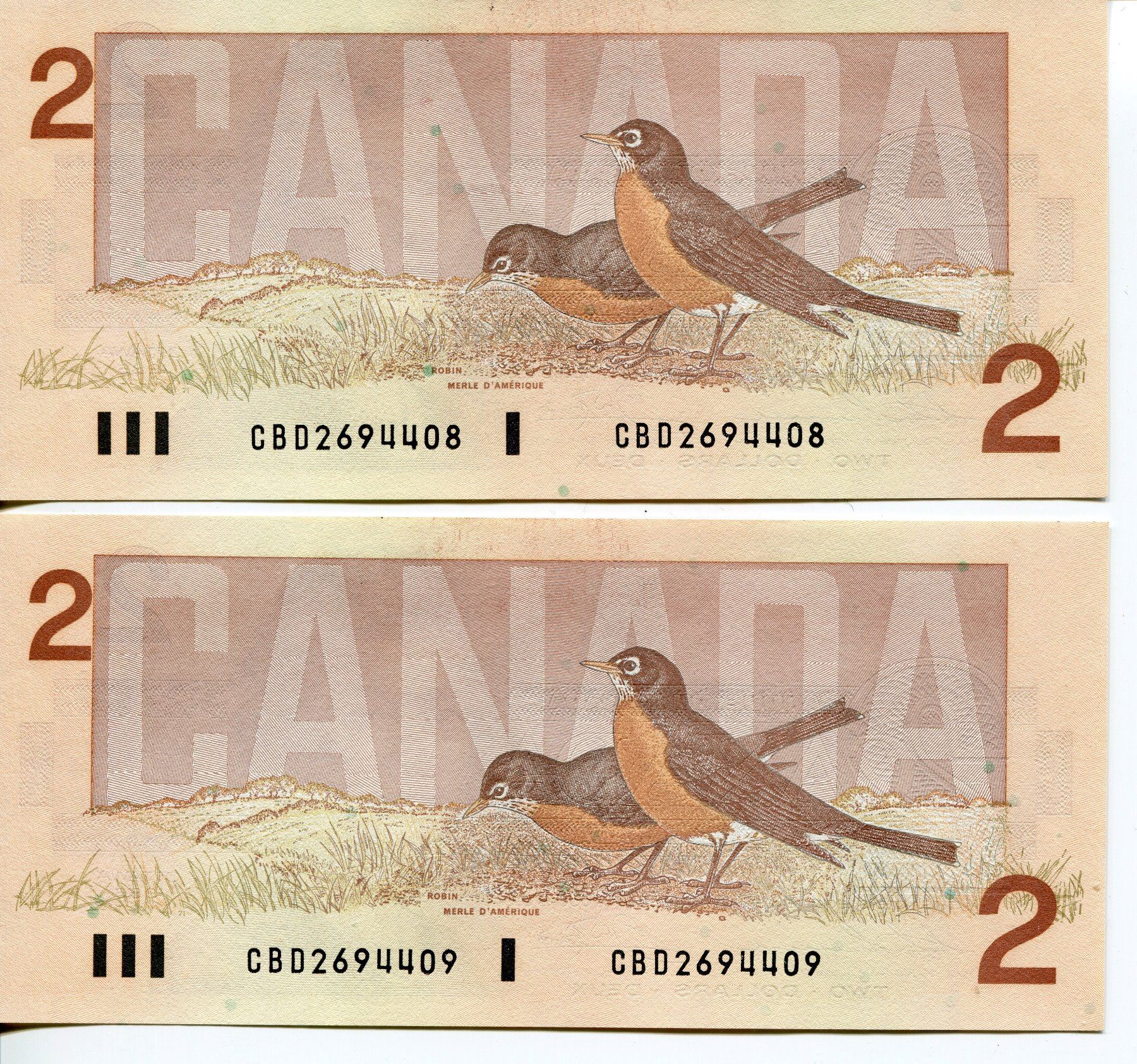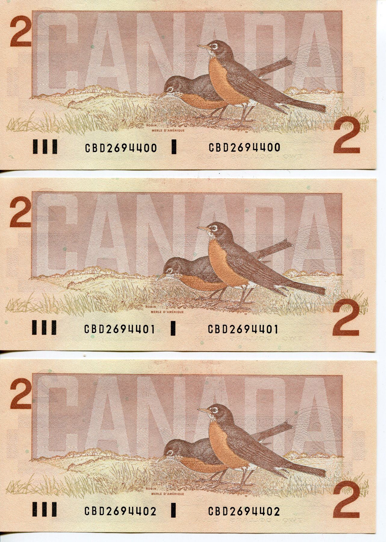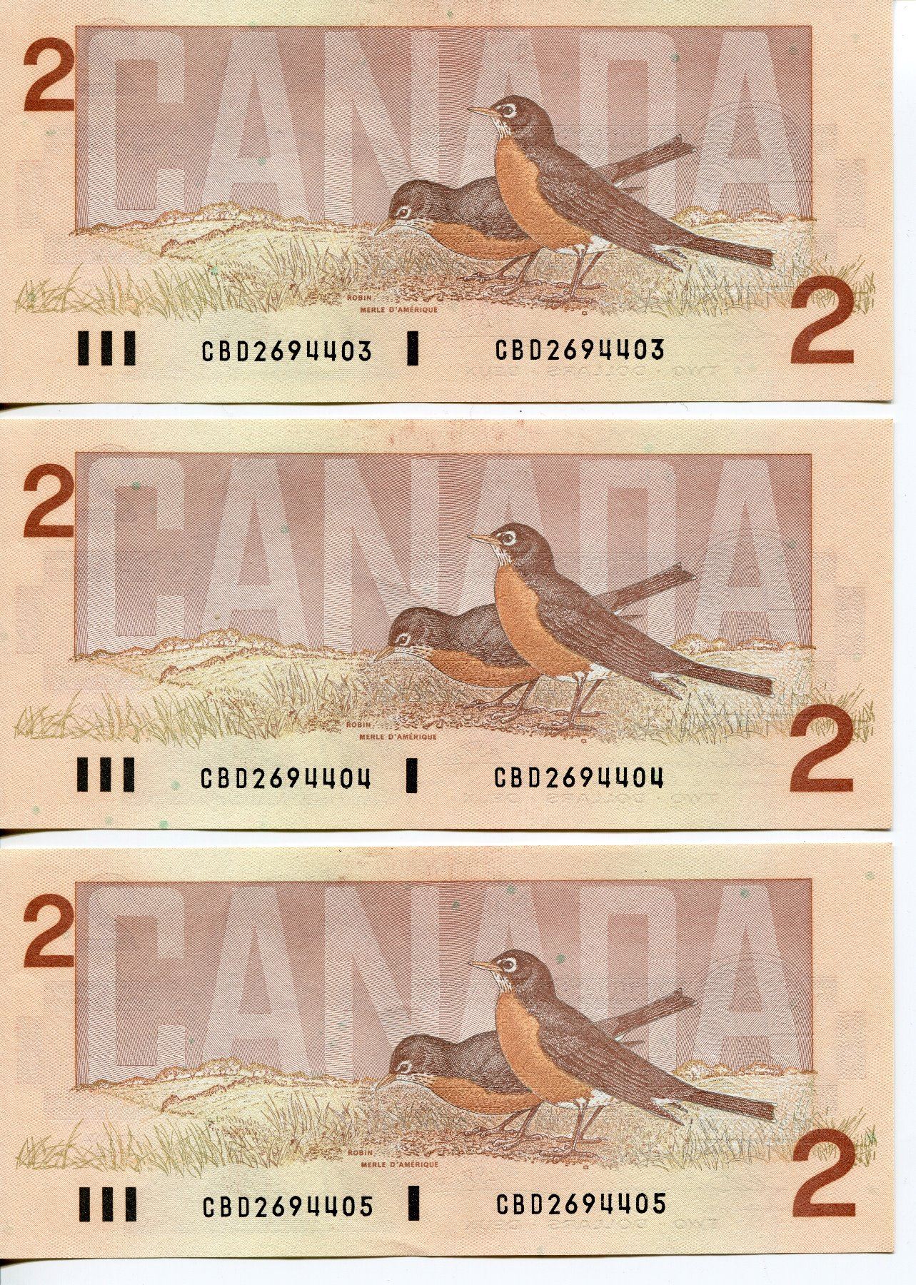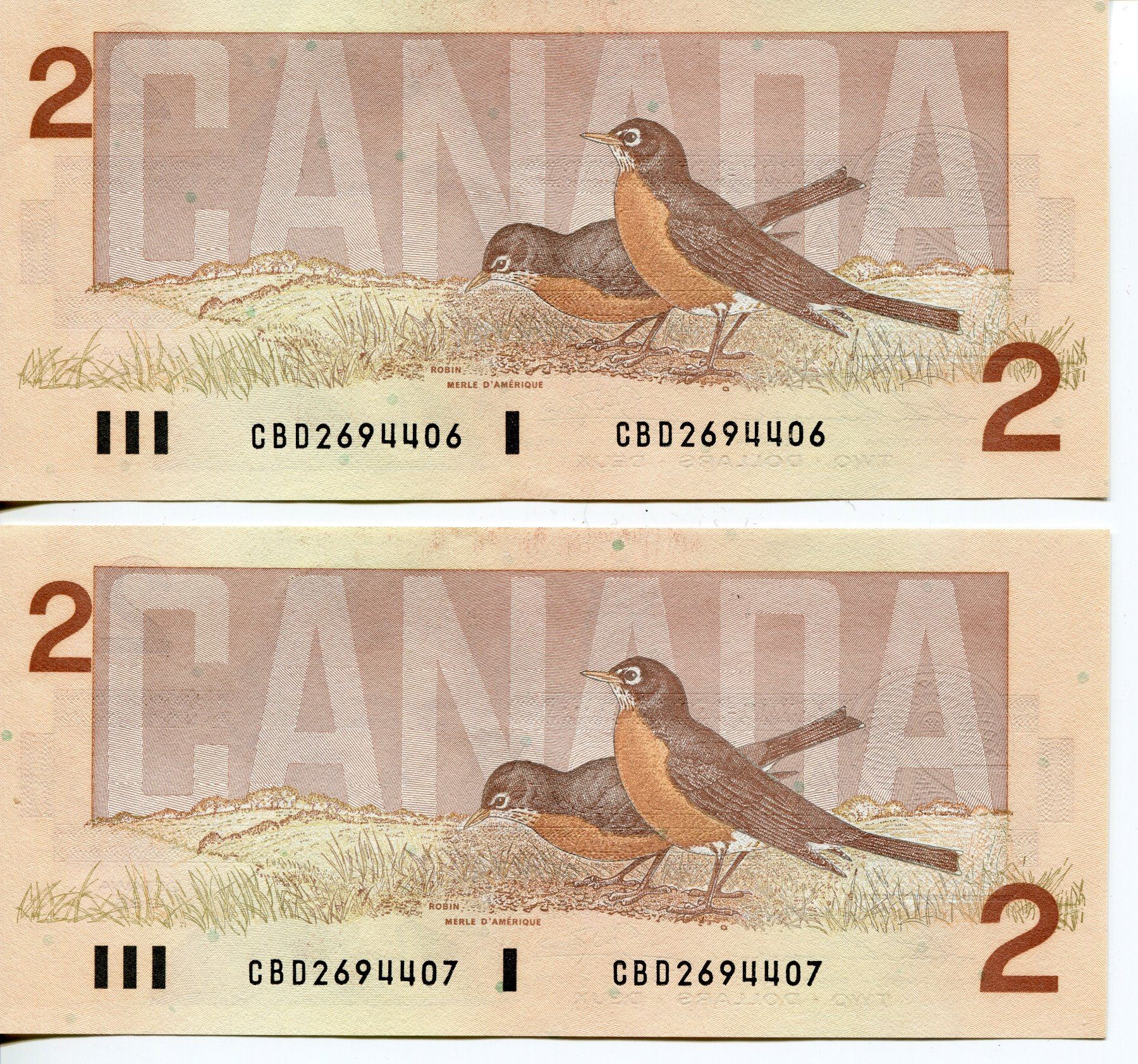 10 CNDN $2 BANK NOTES 1986 CONSECUTIVE THREE LETTER SERIAL NUMBERS THIESSIN/CROWER, UNCIRCULATED
