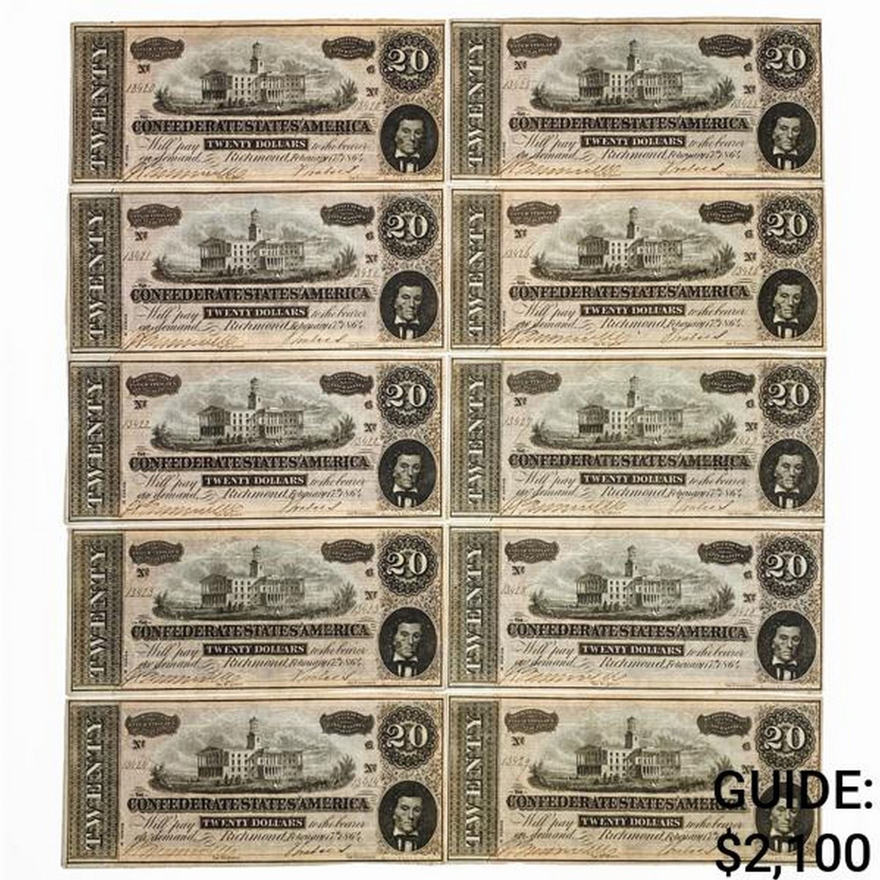 (10) CONSECUTIVE T-67 1864 $20 TWENTY DOLLARS CSA CONFEDERATE STATES OF AMERICA NOTES UNCIRCULATED