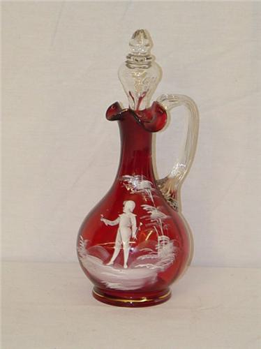 10" CRANBERRY MARY GREGORY CRUET W/ STOPPER-DECORATED W/ BOY IN LANDSCAPE W/ FLOWER - WEAR TO GOLD