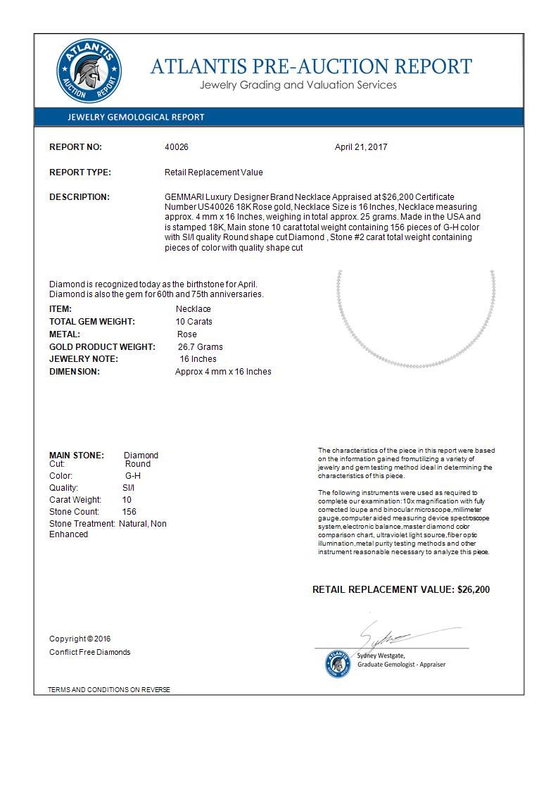 10 CTW Certified SI/I Diamond 2 Prong Necklace 18K Rose Gold ---- Luxury Designer Brand Necklace Appraised Retail Price at $26,200 ---- SKU Number US40026 18K Rose gold Necklace Size is 16 Inches, Necklace measuring approx. 4 mm x 16 Inches, weighing in total approx. 25 grams. Made in the USA and is stamped 18K, Main stone 10 carat total weight containing 156 pieces of G-H color with SI/I quality Round shape cut Diamond , Stone #2 carat total weight containing pieces of color with quality shape cut