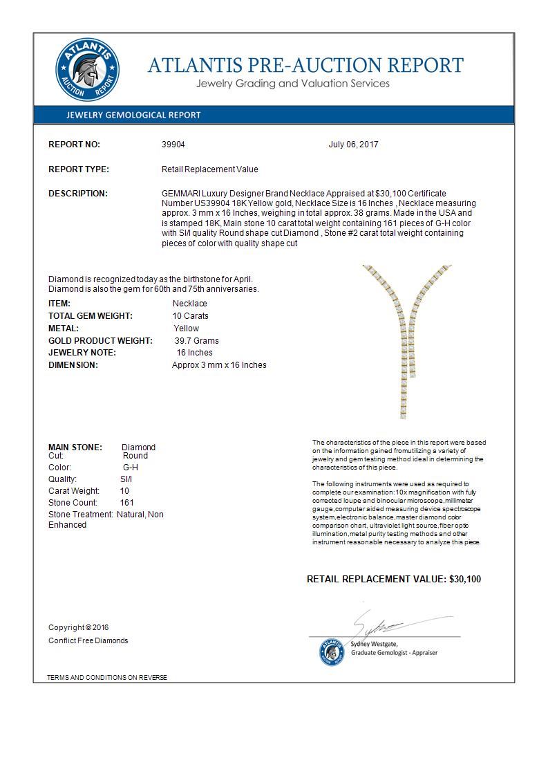 10 CTW Certified SI/I Diamond Necklace 18K Yellow Gold ---- Luxury Designer Brand Necklace Appraised Retail Price at $30,100 ---- SKU Number US39904 18K Yellow gold Necklace Size is 16 Inches , Necklace measuring approx. 3 mm x 16 Inches, weighing in total approx. 38 grams. Made in the USA and is stamped 18K, Main stone 10 carat total weight containing 161 pieces of G-H color with SI/I quality Round shape cut Diamond , Stone #2 carat total weight containing pieces of color with quality shape cut
