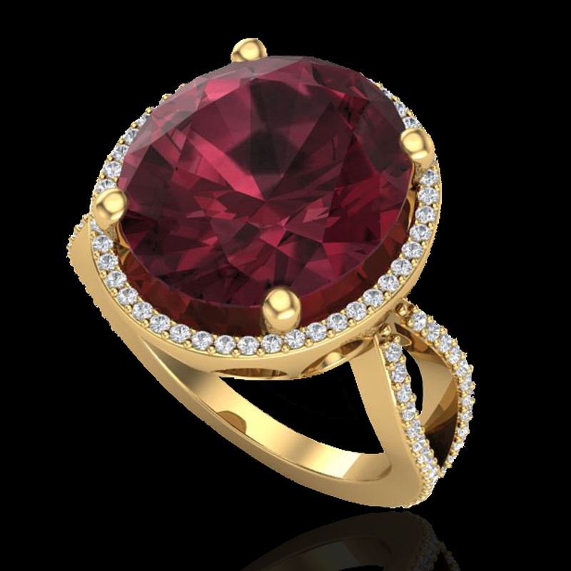 REF-80F2N -20964 ---- 10 CTW Garnet & Micro Pave VS/SI Diamond Halo Ring 18K Yellow Gold ---- Luxury Designer Brand Ring Appraised at $5,300 Certificate Number US20964 18k Yellow gold, Ring Size is 7, Ring measuring approx. 6/8" X 5/8" , weighing in total approx. 4.2 grams. Made in the USA and is stamped 18k, Main stone 9.5 carat total weight containing 1 pieces of Saturated purplish Red color with AAA quality Oval shape cut Garnet , Stone #2 0.5 carat total weight containing 64 pieces of H-I color with VS/SI quality Round shape cut Diamond