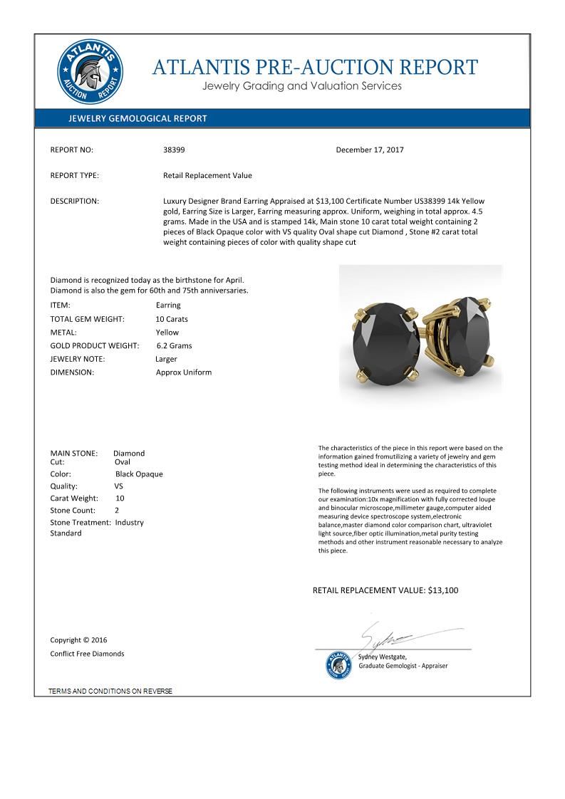 REF-216A2X -38399 ---- 10 CTW Oval Black Diamond Stud Designer Earrings 14K Yellow Gold ---- Luxury Designer Brand Earring Appraised at $13,100 Certificate Number US38399 14k Yellow gold, Earring Size is Larger, Earring measuring approx. Uniform, weighing in total approx. 4.5 grams. Made in the USA and is stamped 14k, Main stone 10 carat total weight containing 2 pieces of Black Opaque color with VS quality Oval shape cut Diamond , Stone #2 carat total weight containing pieces of color with quality shape cut