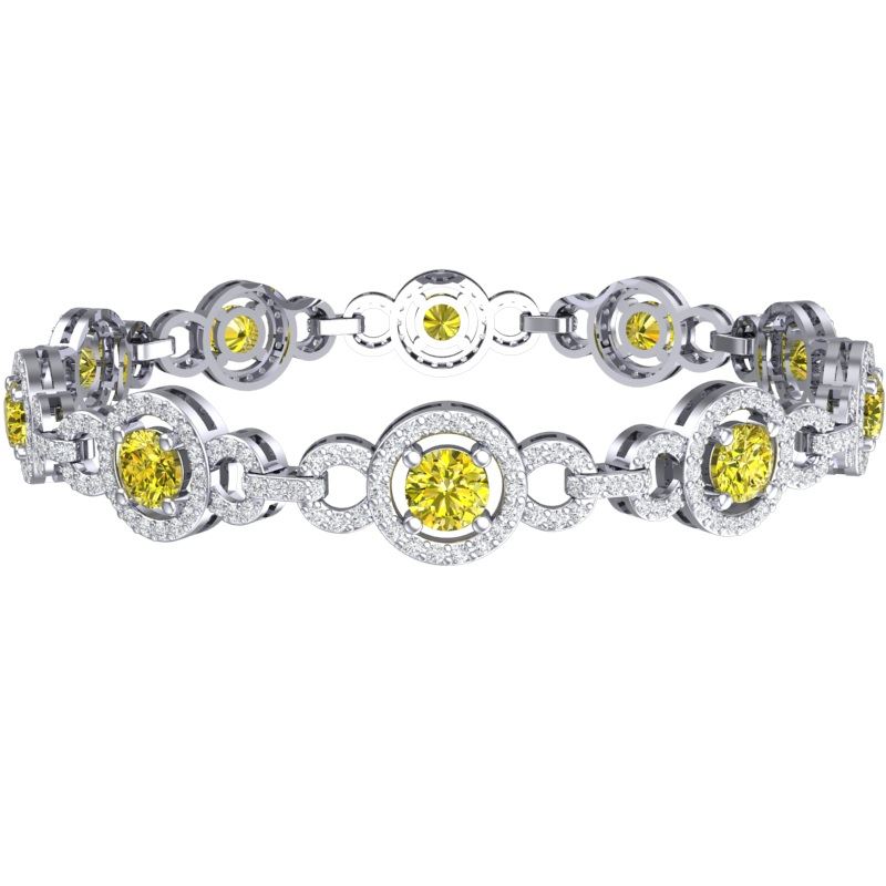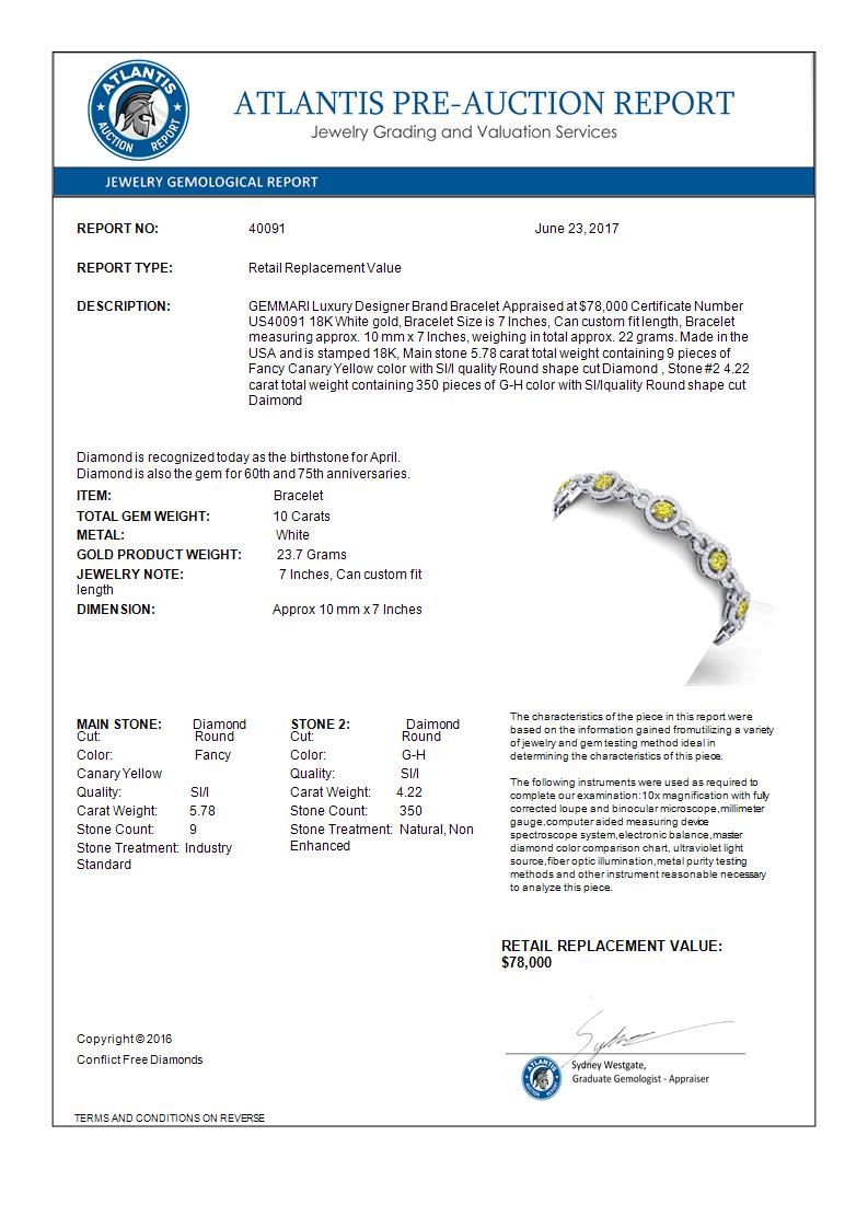 10 CTW Si/I Fancy Yellow And White Diamond Bracelet 18K White Gold ---- Luxury Designer Brand Bracelet Appraised Retail Price at $78,000 ---- SKU Number US40091 18K White gold Bracelet Size is 7 Inches, Can custom fit length, Bracelet measuring approx. 10 mm x 7 Inches, weighing in total approx. 22 grams. Made in the USA and is stamped 18K, Main stone 5.78 carat total weight containing 9 pieces of Fancy Canary Yellow color with SI/I quality Round shape cut Diamond , Stone #2 4.22 carat total weight containing 350 pieces of G-H color with SI/I quality Round shape cut