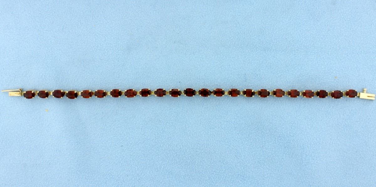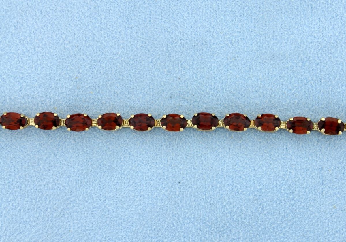 The bracelet measures 7" long. The oval is 6mmx4mm. Garnets are very bright, this is a very well made 14k yellow gold bracelet. 5.8g