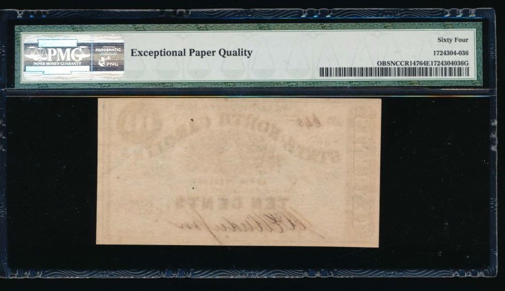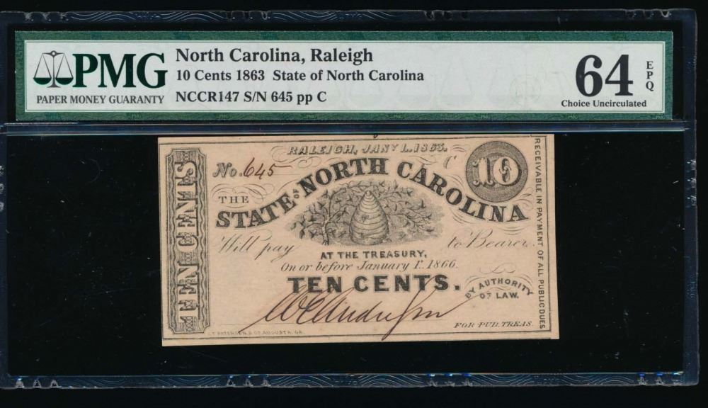 One 10 Cent 1863 Raleigh NC Obsolete Note PMG 64EPQ.
