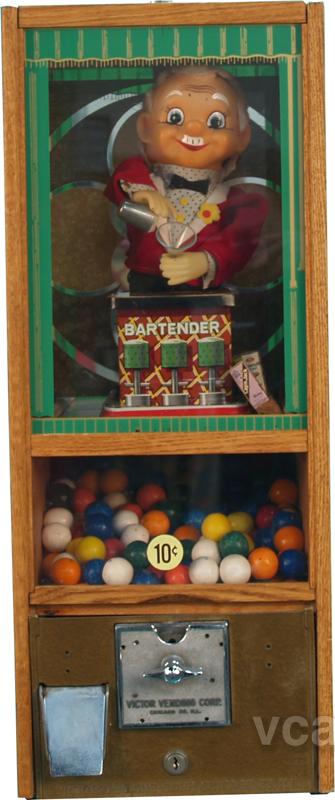 10 Cent Wooden Victor Vending Machine w/ Little Bartender Puppet Inside Pouring Drinks w/ Keys