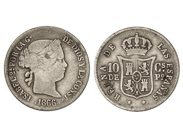 10 Centavos de Peso. 1866. MANILA. (Rayitas y golpecitos). RARA. Cal-463. BC+.