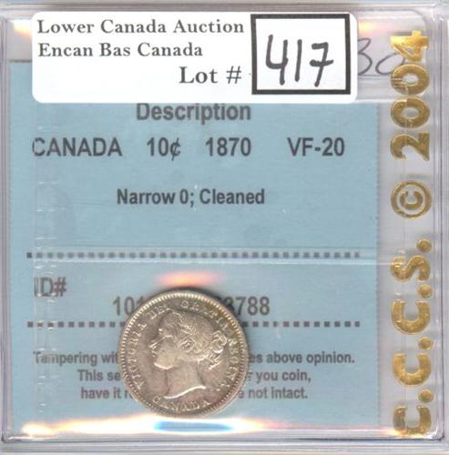 1870 Narrow 0 CCCS certified VF-20; Cleaned. Weak obverse.