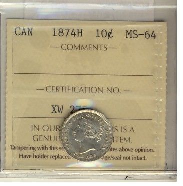 10 Cents 1874H, ICCS MS-64. Crisp and sharp white.