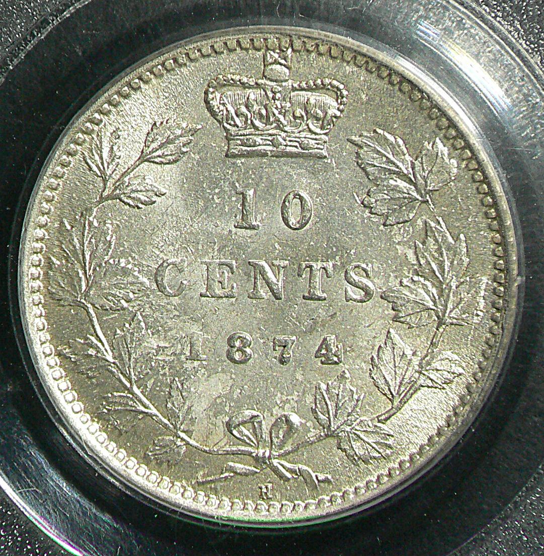 10 Cents 1874H, graded PCGS MS-63. Untoned coin.
