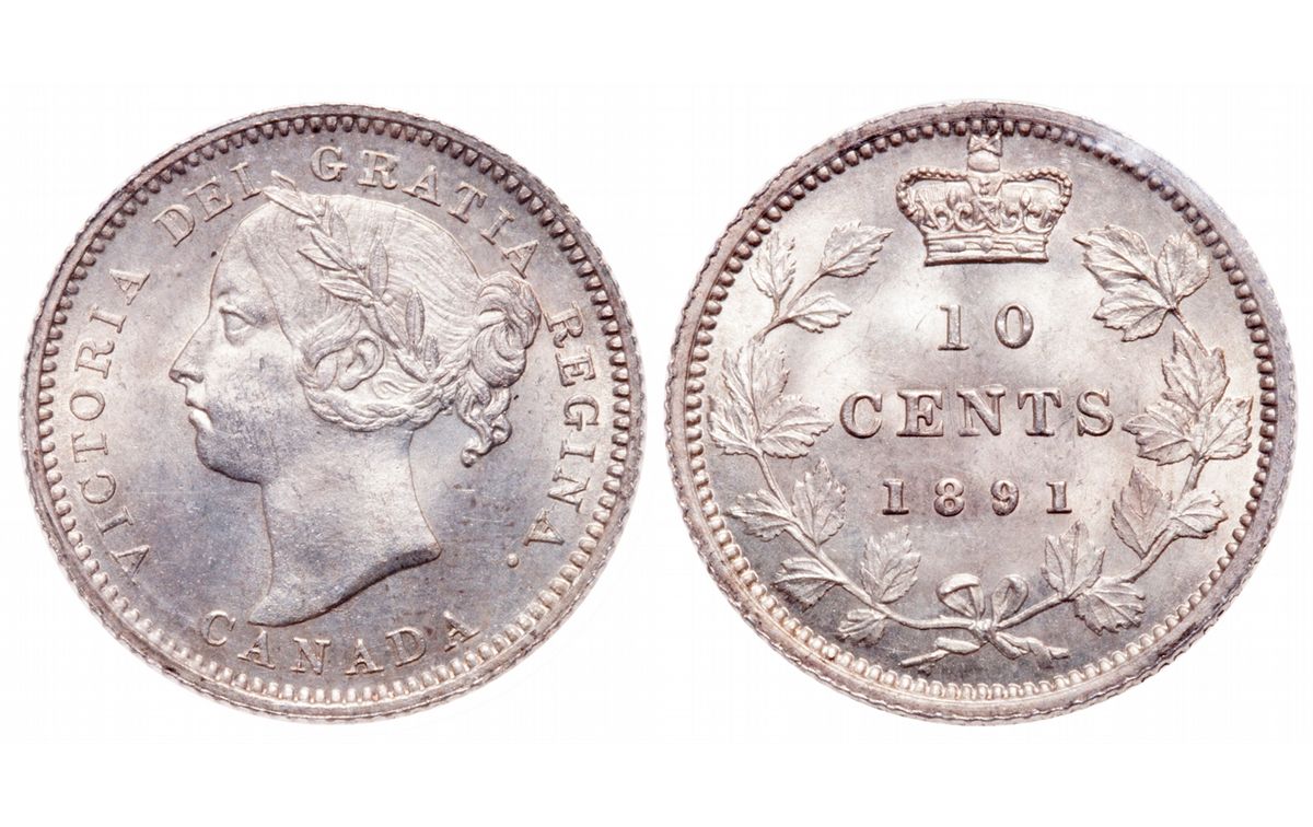 10 Cents. 1891. 21 Leaves. ICCS graded Gem Uncirculated-65. Especially nice reverse surfaces and details, with light topaz toning overall. Top 5 census, with only 2 coins graded finer by ICCS in MS-66.