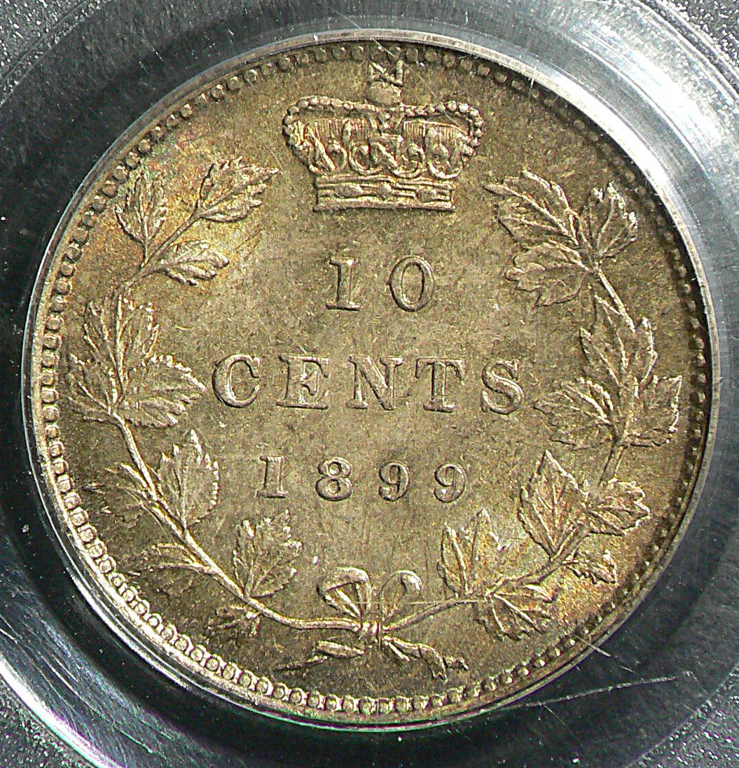 10 Cents 1899, graded PCGS MS-66; Small 9. Superb coin with beautiful toning.