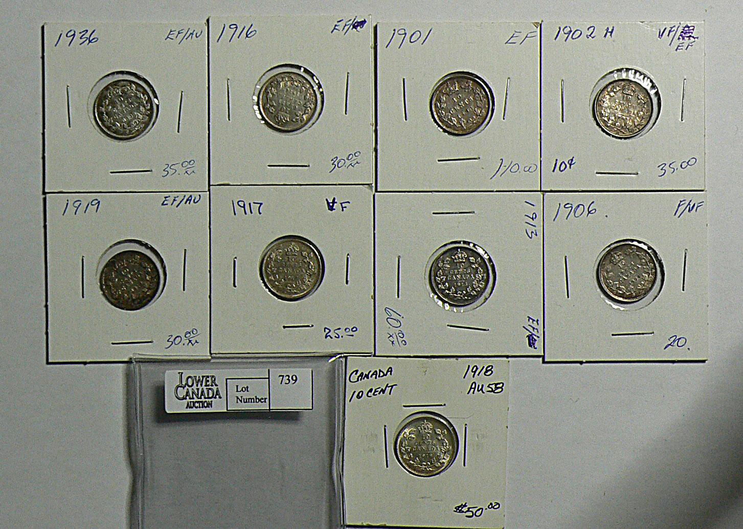 10 Cents 1901 EF, 1902H VF, 1906 VF, 1913 EF, 1916 EF, 1917 VF, 1918 AU, 1919 EF, 1936 EF. Grade var