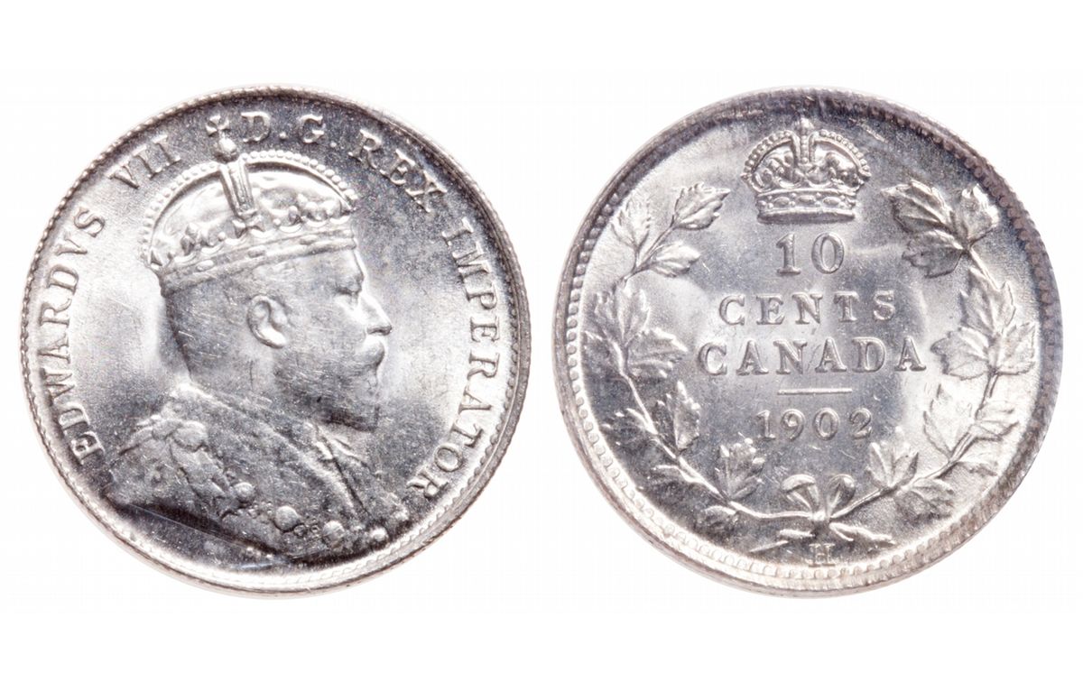 10 Cents. 1902-H. ICCS graded Gem Uncirculated-65. Brilliant and lustrous. Only 5 coins graded finer by ICCS.