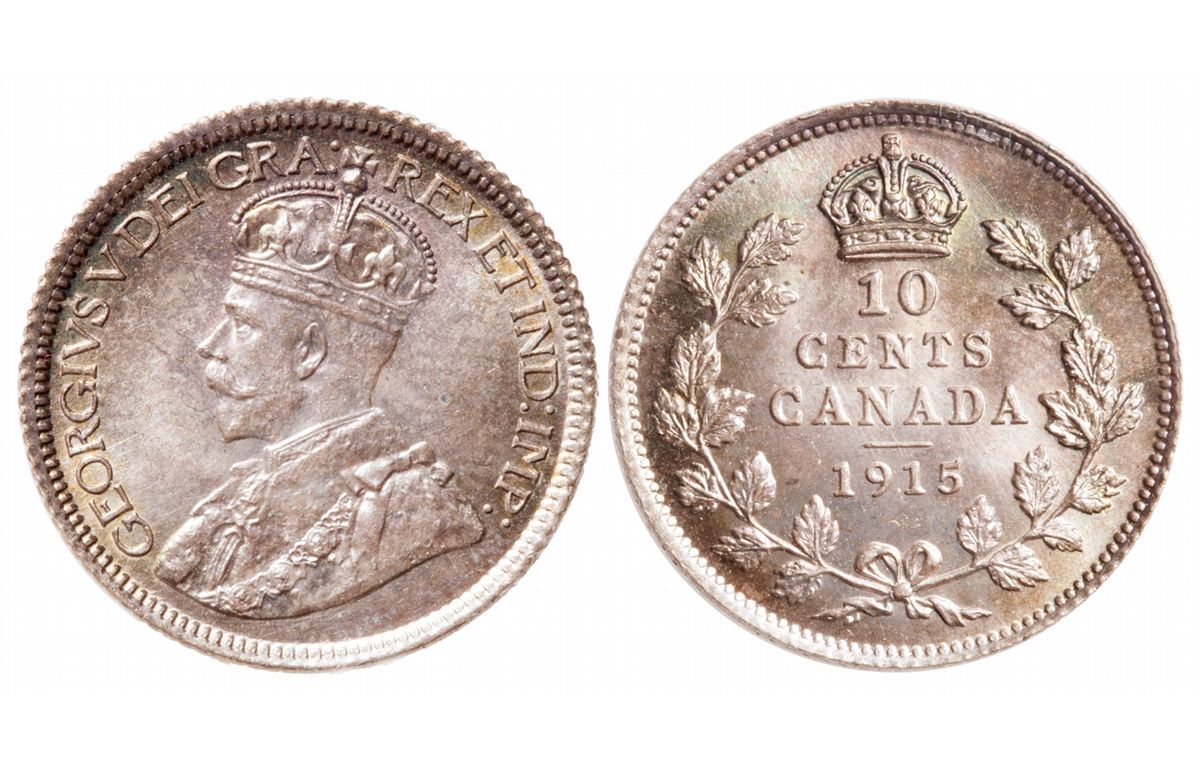 10 Cents. 1915. ICCS graded Superb Gem Uncirculated-66. Being relatively scarce, with a low mintage of only 688,057 pieces, the 1915 10 cent is even more elusive in mint state. In fact ICCS has graded fewer 1915's in MS than any other year for George V, with only 48 pieces in MS-60 or better, and a mere 8 coins in gem. This example is tied as finest known with just two others. Superbly struck, with full detail and even, balanced lustre. The fields are immaculate even under close inspection, and subtle violet toning is accented by hues of orange-gold and green. A premium rarity.