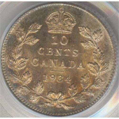 10 Cents 1934, graded PCGS MS-66. Fully struck with intense blue and gold tones. A PQ Gem.
