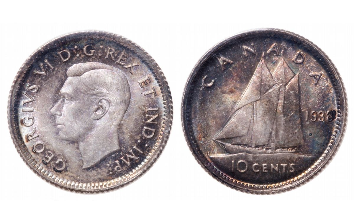 10 Cents. 1938. ICCS graded Superb Gem Uncirculated-66. Toned to lavender-grey with perimeter highlights of blue, violet and gold, more pronounced on the reverse. The design is well-struck and sharp, with stately lustre. The bust is approaching cameo. Tied one of only 3 finest graded by ICCS.