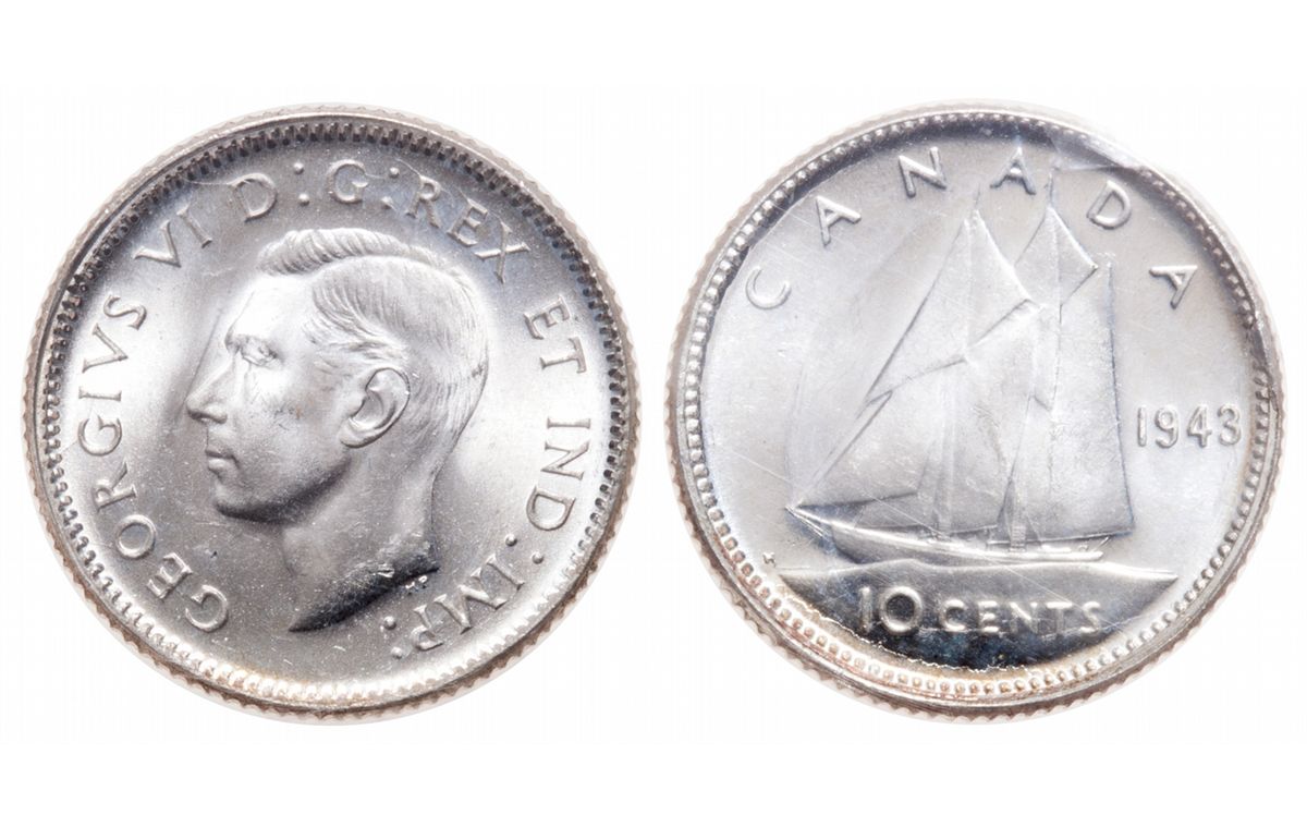 10 Cents. 1943. ICCS graded Superb Gem Uncirculated-66. Brilliant with a trace of straw coloured toning. Deeply lustrous. One of only two graded MS-66 by ICCS, with none finer.