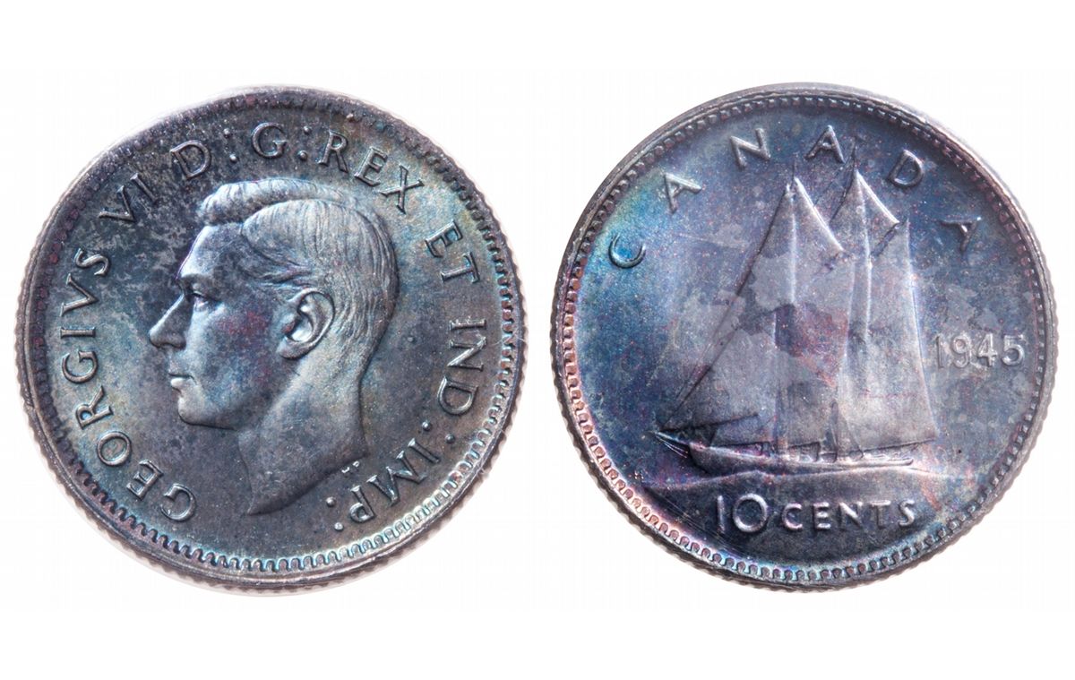 10 Cents. 1945. ICCS graded Superb Gem Uncirculated-66. Toned a deep, even blue with violet accents. One of only two finest graded by ICCS.