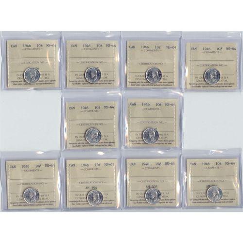 10 Cents 1946, graded ICCS MS-64. Lot of 10 coins all brilliant and white.