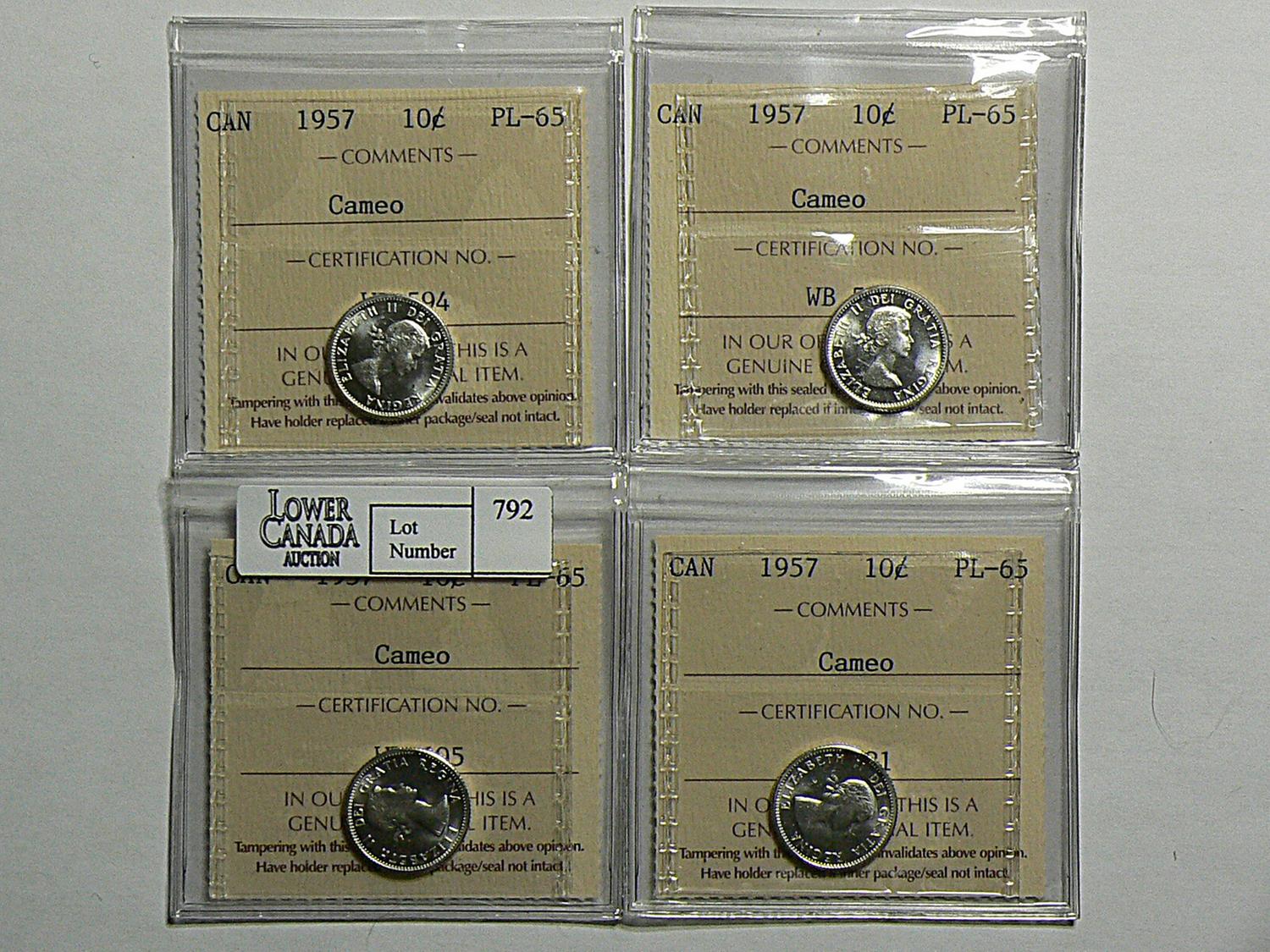 10 Cents 1957, graded ICCS PL-65 Cameo, Lot of 4 coins.