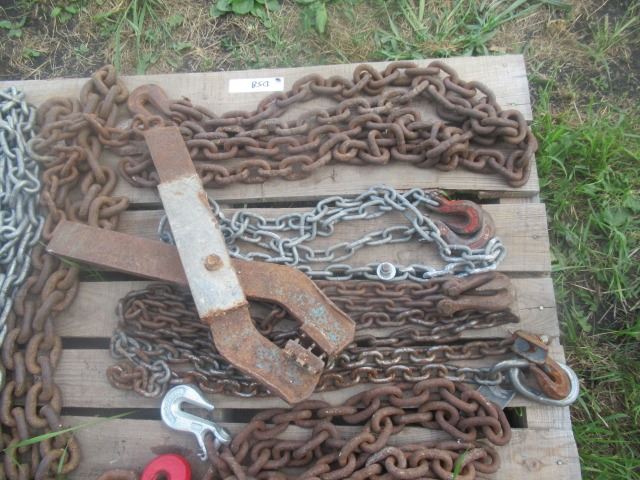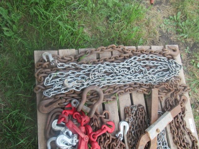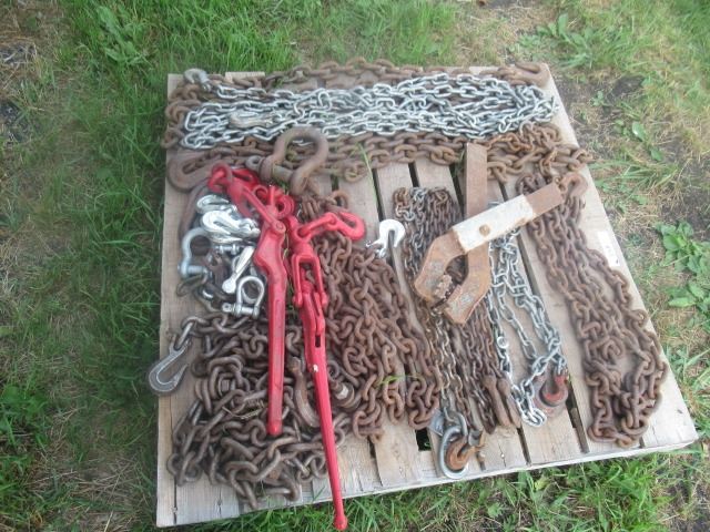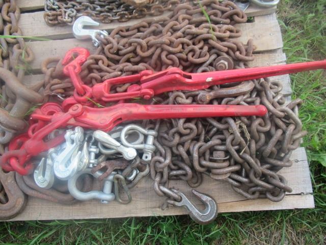 10) Chains & Hooks 10' to 30', Clevis' Hooks, Pallet Grab, & 2 Load Binders