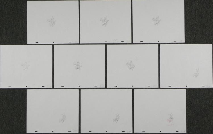Take a bite of these Cheerios * * 10 Original Animation DrawingsDetails: Animation notations and peg holes * Original "rough" animation drawing, in black pencil * Size of drawing: 10 1/2 x 12 1/2 inches * Condition: Very good * Traditional animation is a * multi-step process which includes various types of art techniques. * Drawings are a key part of the process, in which the animator creates * the design and movement of the characters. Drawings are then transferred * onto acetate cels. There are 10 different drawing of Buzz, the Cheerios bee.