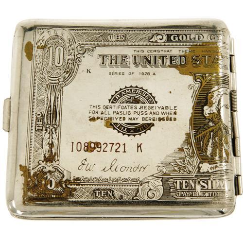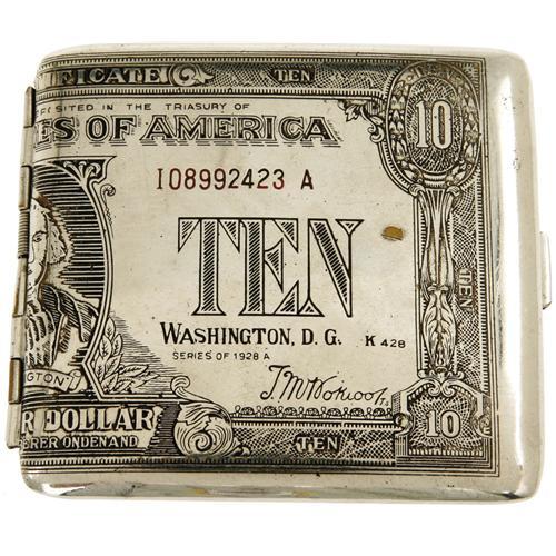 <B>$10 Cigarette Case.</B></I> This is a nice half-sized case based on a $10 1928A Silver Certificate. It has an operating hinge, spring, and clip.<BR><BR><b>Shipping:</b> Coins & Currency (<a target="_blank" href="http://www.heritageauctions.com/common/shipping.php">view shipping information</a>)
