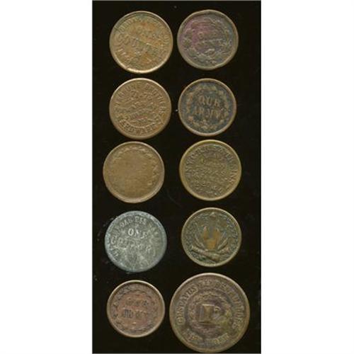 <B>10-Piece Lot of Civil War Patriotic-Merchant Tokens.</B></I> Ten Civil War merchant and patriotic tokens, a great starter collection for a young person just beginning to collect this interesting chapter in American history.<BR><BR><b>Shipping:</b> Coins & Currency (<a target="_blank" href="http://www.heritageauctions.com/common/shipping.php">view shipping information</a>)