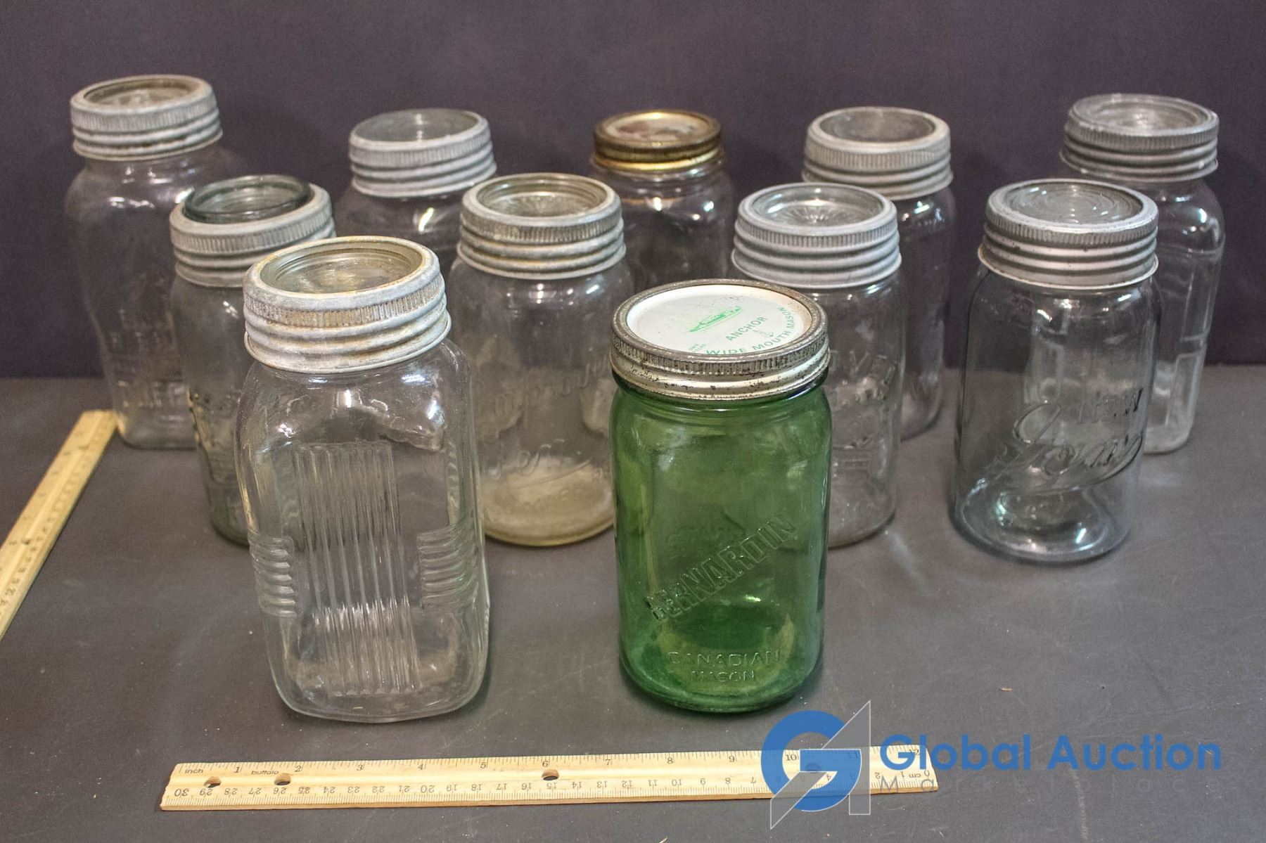 (10) Clear Glass Jars & (1) Green Glass Jar