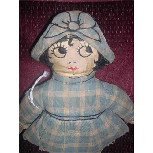 10" Cloth Doll with Stitched Face. She has eyes to the side. She reminds me of a Betty Boop type. The silk covering on arms and legs is shredding and in pieces in places.She's dingy and has been loved. Doll comes from a smoke free environment. Buyer to pay $10 for shipping, handling, and insurance. Thanks for viewing.