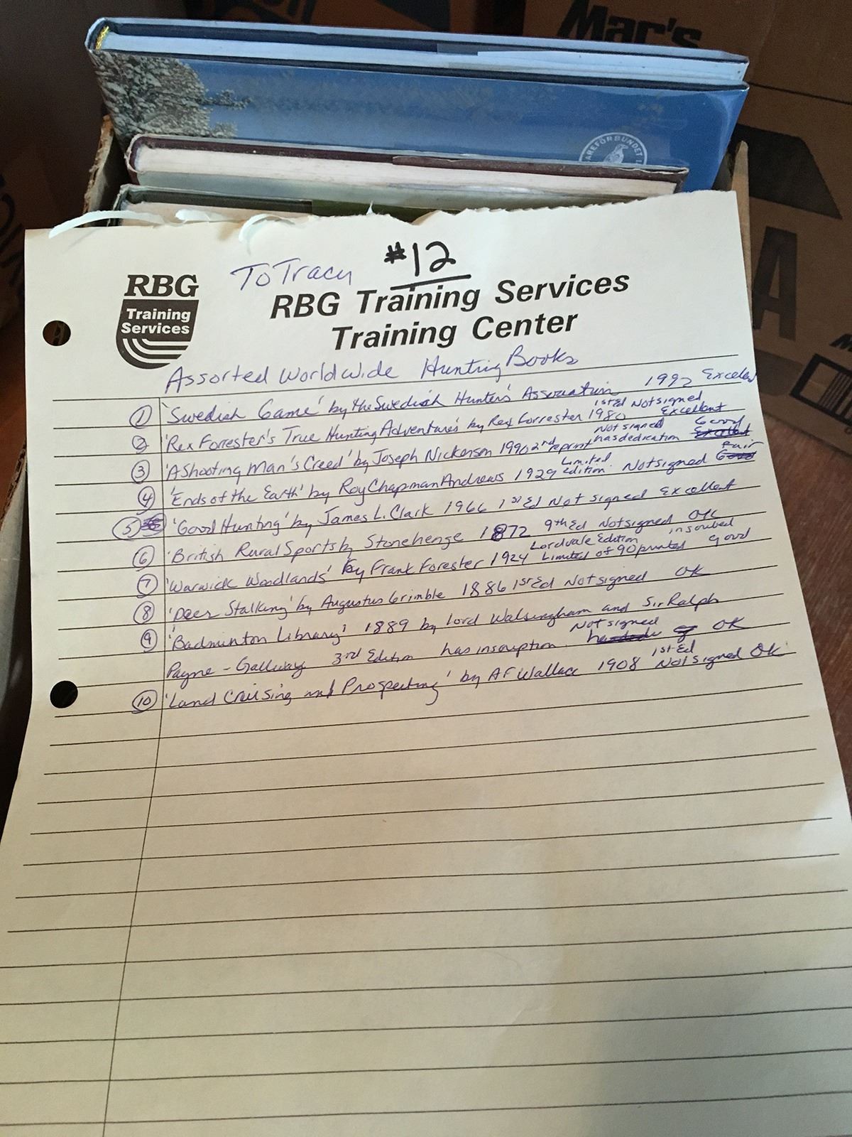 10 Collectible Hunting books including first editions, limited editions, and early books including: Rex Forrester's True Hunting Adventure's by Rex Correster, 1980, First Edition; Ends of the Earth by Roy Chapman Andrews, 1929, Limited Edition; Good Hunting by James L. Clark, 1966, First Edition; British Rural Sports by Stonehenge, 1872; Deer Stalking by Augustus Grimble, 1886, First Edition; Badminton Library, 1889 by Lord Walsingham and Sir Ralph; Land Cruising and Prospecting by A. F. Wallace, 1908, First Edition, etc. All from a lifetime collection (RL)