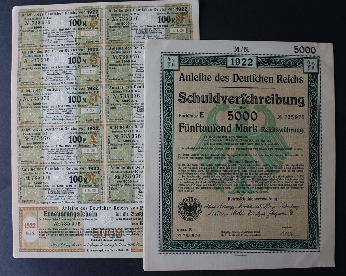 10 Consecutive 1922 5000 Mark German Treasury Bonds with uncanceled coupons, AU