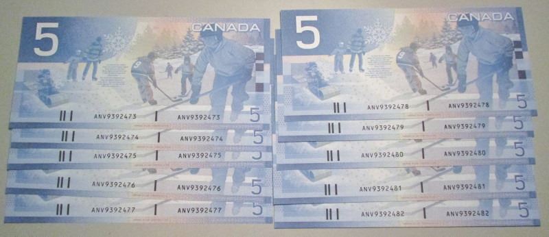 10 Consecutive 2002 Bank Of Canada $5 Bank Notes- GEM UNC - Trends Value $175