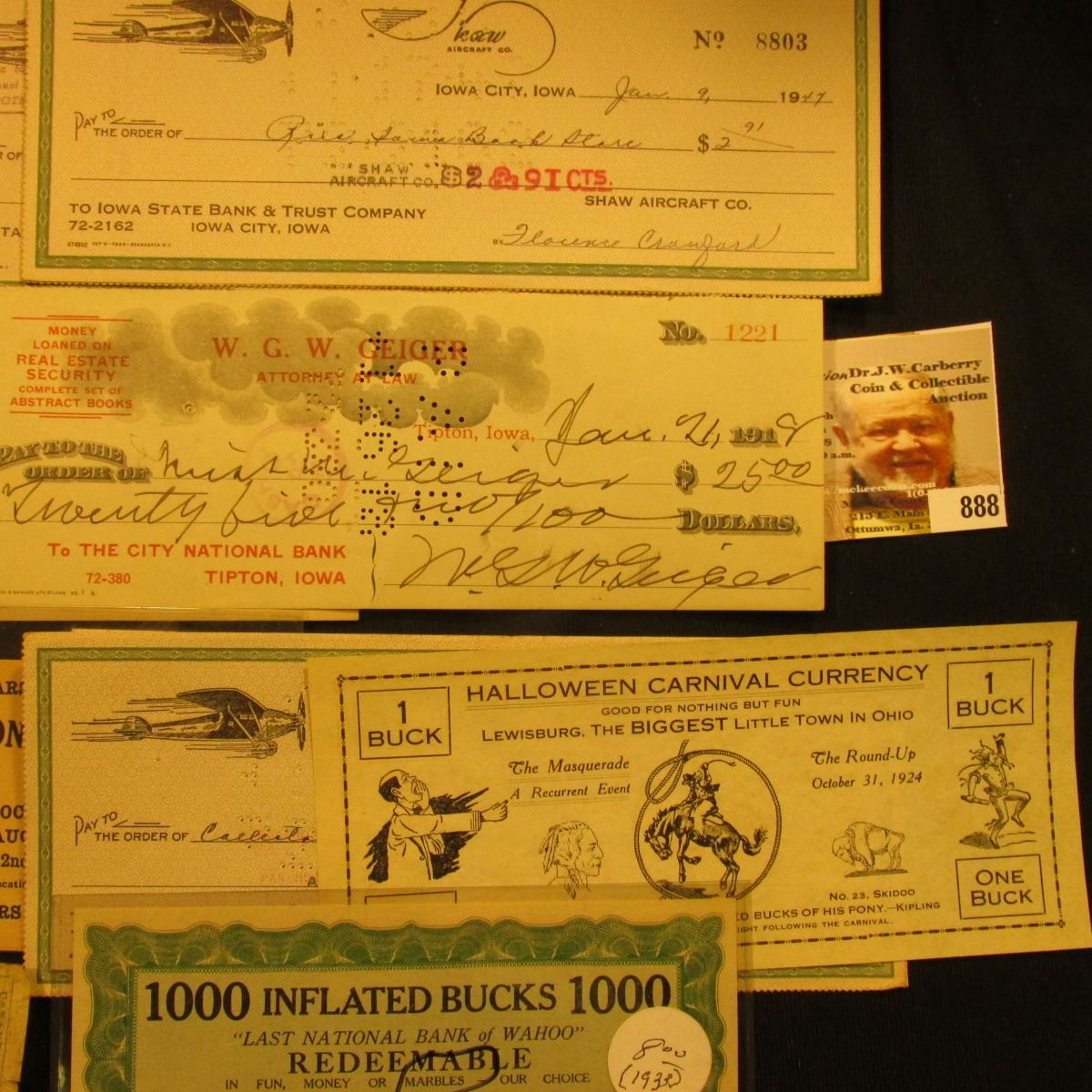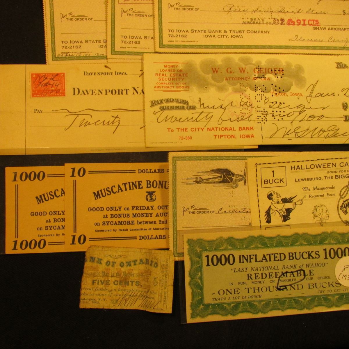 (10) Consecutive Serial Number Checks from "Shaw Aircraft Co., Iowa City, Iowa" 1946-47; (2) Different 1951 "Muscatine (Iowa) Bonus Money" Scrip; Oct. 31, 1924 Lewisburg, Ohio Scrip; partial 1862 Civil War Era New York note drawn on the Bank of Ontario; 1900 Davenport National Bank (Iowa) Check with 2c Documentary Stamp; "City National Bank Tipton, Iowa 1918 Check; & "1000 Inflated Bucks 1000 "Last National Bank of Wahoo" Redeemable in Fun, Money, or Marbles-Our Choice".