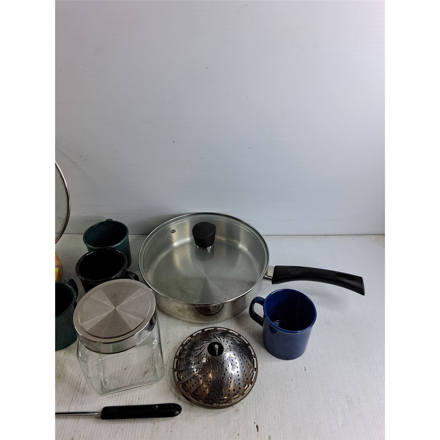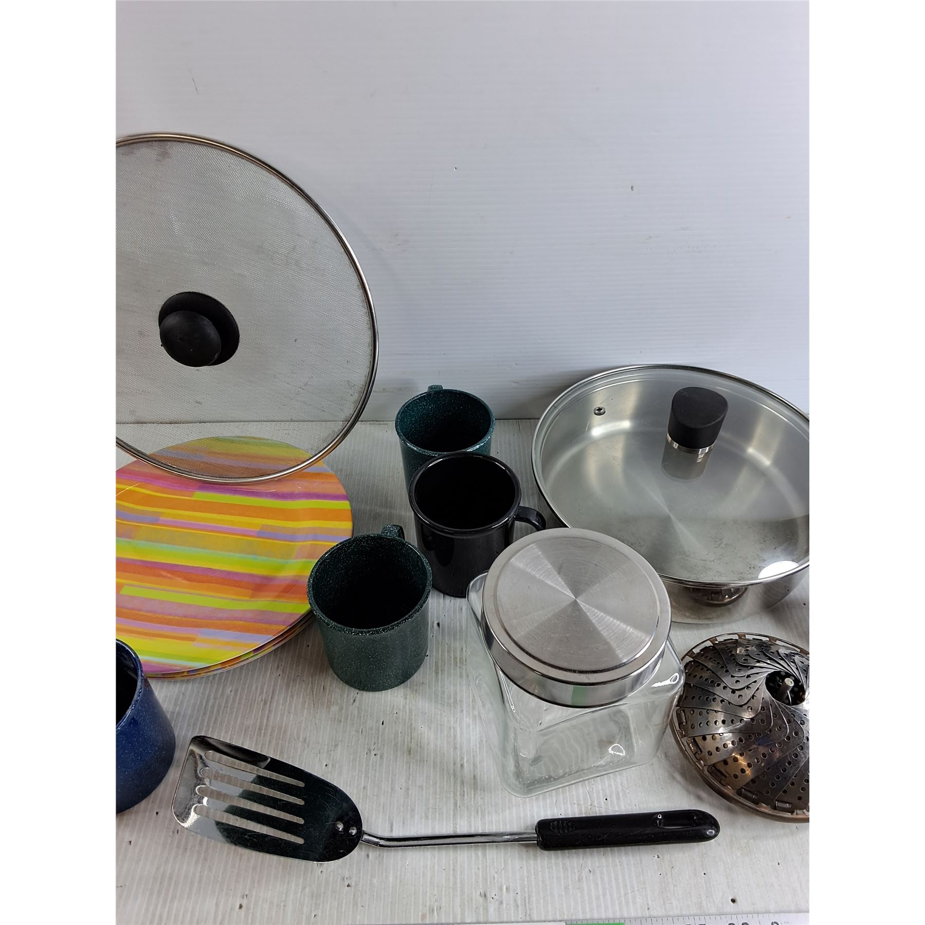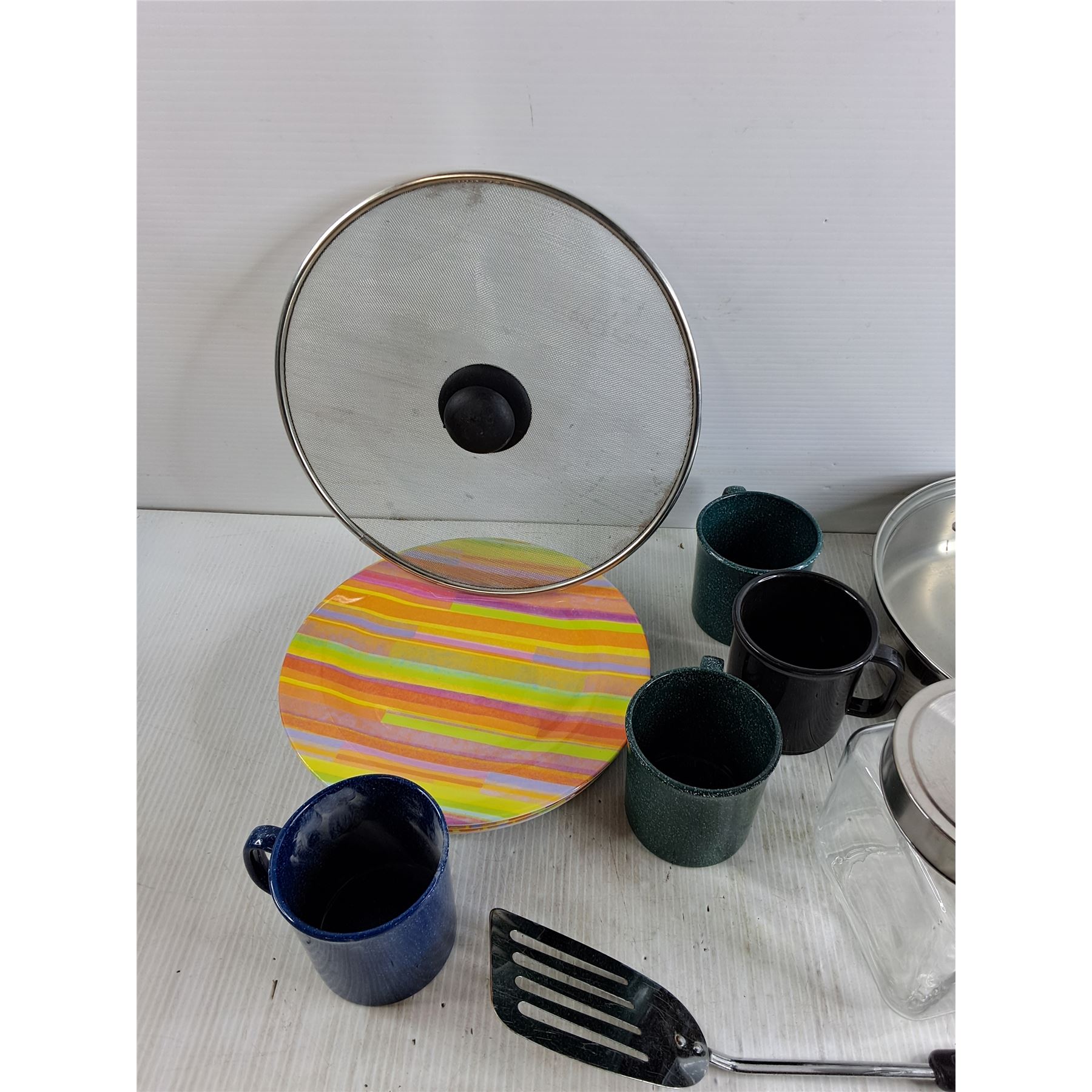 10" Cooking Pan with Lid, Plastic Plates, Spatula, Camping Mugs, Storage Jar, Steamer, Splatter Lid
