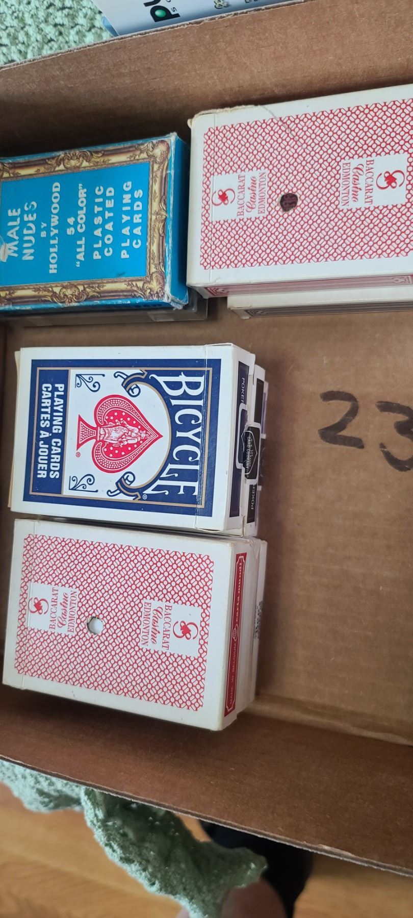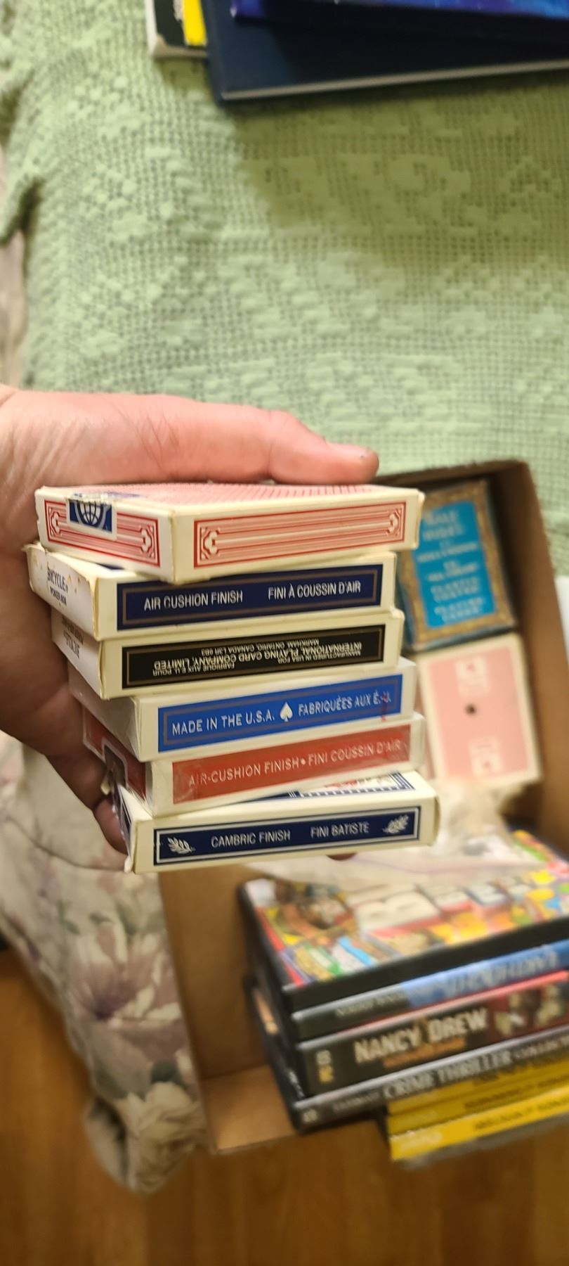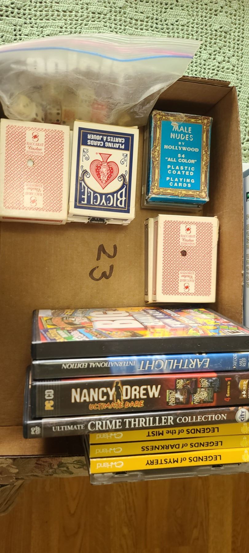 10 DECKS OF PLAYING CARDS, DICE AND ASSORTED CD GAMES