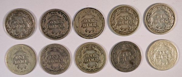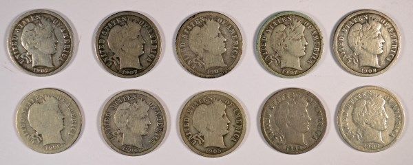 10 DIFFERENT BARBER DIMES (O5-S,06,06-D,06-O,06-S,07,07-D,07-O,07-S,08) AG-FINE