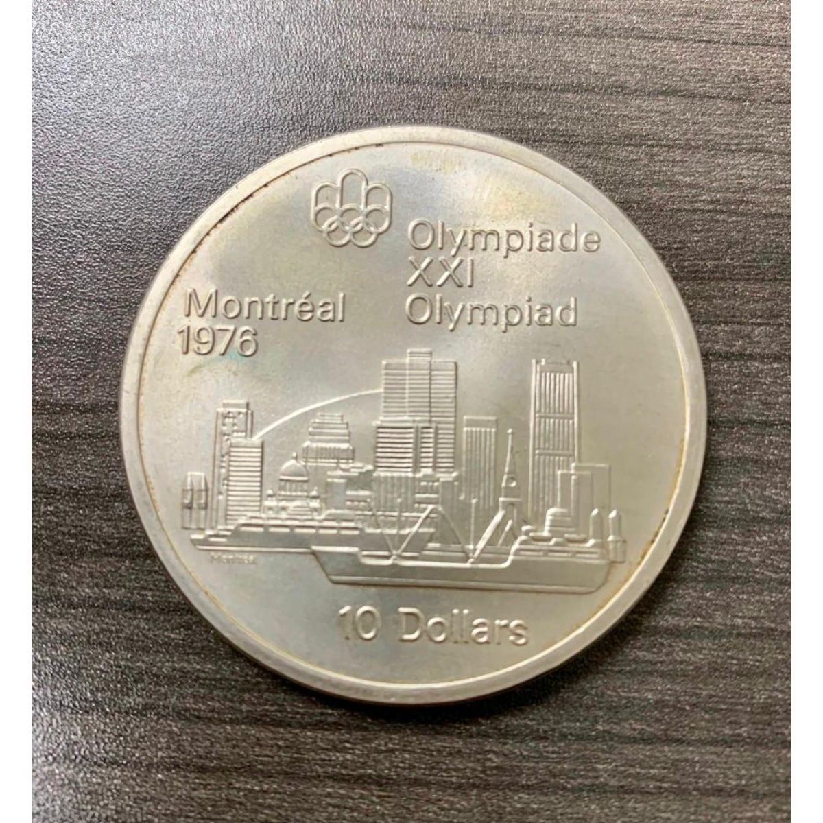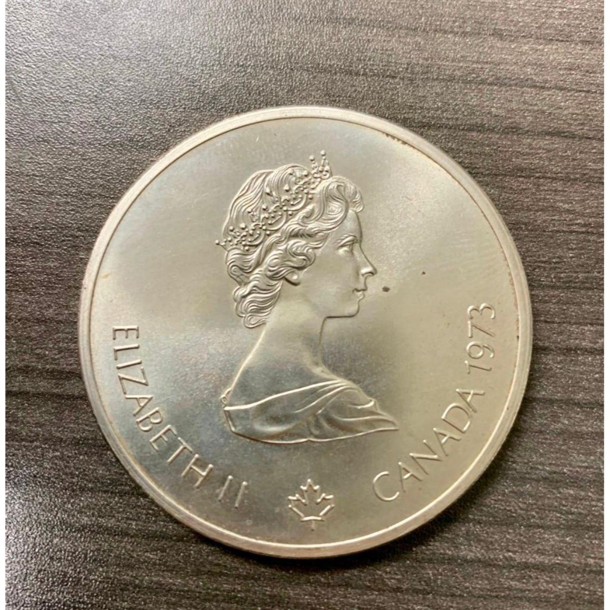 Commemorative issue 1976 Olympics, Montreal Obverse Lettering: ELIZABETH II CANADA 1973 Engraver: Arnold Machin Reverse Lettering: Olympiade XXI Montreal Olympiad 1976 10 Dollars Engraver: Georges Huel Edge Milled Specifications Country: Canada Type: Non-circulating coin Year: 1973 Value: 10 Dollars (10 CAD) Currency: Canadian dollar (1858-date) Composition: Silver (.925) Weight: 48.6 g Diameter: 45 mm Shape: Round