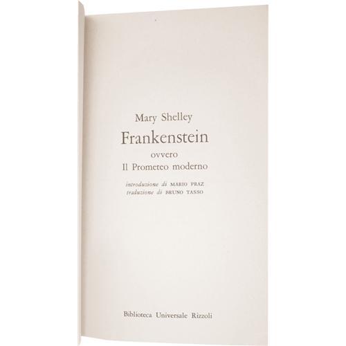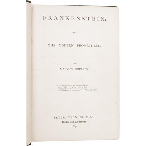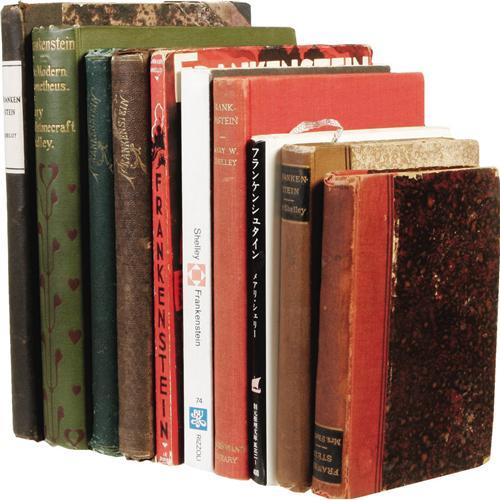 <B>Mary Shelley: Ten Editions of <I>Frankenstein</B></I></B></I> <B>From Boston to Japan.</B></I> Includes the following: <BR><B><I>Frankenstein; or, the Modern Prometheus.</B></I></B></I> (London: J. M. Dent & Sons, 1949), 242 pages, red cloth binding with gilt lettering on spine, 16mo (4.25" x 6.75"). The copy presented here is very good. Minor edge wear and corner wear is present, with the spine lightly sunned.<BR><B><I>Frankenstein; or, the Modern Prometheus</B></I></B></I> (text in Japanese), 329 pages, paperback, dust jacket, 16mo (4.25" x 6"). This copy is very good, with minimal edge wear to the jacket.<BR><B>May Mary Shelley: <I>Frankenstein.</B></I></B></I> (Bruxelles: Le Scribe, 1946), 132 pages, red illustrated wrappers, 12mo (5" x 7.25"). Author incorrectly written on title page as May W. Shelley and on cover as Ann Mary Shelley. Wrappers show minor wear, especially to spine. Textblock slightly age-toned.<BR><B><I>Frankenstein ovvero Il Prometeo moderno.</B></I></B></I> (Milan: Biblioteca Universale Rizzoli, 1952), 209 pages, illustrated wrappers, 12mo (4.25" x 7"). This copy is in good condition. The spine is slightly cocked. Textblock is clean and bright.<BR><B><I>Frankenstein or the Modern Prometheus.</B></I></B></I> (London: George Routledge and Sons, 1888), 317 pages, brown cloth spine with marbled boards, 24mo (4.25" x 5.75"). Previous owner's signature on front free endpaper. This copy is good, with the edges and corners rubbed, spine soiled, and light rubbing to boards. Textblock is clean.<BR><B><I>Frankenstein; or, the Modern Prometheus.</B></I></B></I> (Boston: Sever, Francis, & Co., 1869), 177 pages, green cloth binding with gilt lettering on spine, 12mo (5.25" x 7.25"). The copy presented here is in good condition, with the head and tail of spine and corners bumped, and minor edge wear. The textblock is clean.<BR><B><I>Frankenstein; or, the Modern Prometheus.</B></I></B></I> (Boston: Sever, Francis & Co., 1869), 177 pages, brown cloth with gilt lettering on spine and front board, 12mo (5.25" x 7.25"). Waterville Library Assoc. stamped on title page. The book is good, with the front and back pastedowns cracked along hinge, 1" x 1.5" missing from top corner and 1" closed tear along fore edge of front free endpaper. The textblock is lightly age-toned. Head and tail of spine bumped, spine cocked, general wear to boards.<BR><B><I>Frankenstein; or, the Modern Prometheus.</B></I></B></I> (London: Gibbings and Company, 1897), 268 pages, green cloth with gilt lettering on spine and decorative stamping on spine and front board, 12mo (5.25" x 7.75"). Deckled fore-edge. Previous owner's signature and stamp on front free endpaper and back pastedown. This copy is good, with the head and tail of spine bumped, tips of corners rubbed. Spine slightly cocked.<BR><B><I>Frankenstein; or, the Modern Prometheus.</B></I></B></I> (London: George Routledge and Sons, 1887 ), 156 pages with six pages of advertising, black cloth with marbled boards, 8vo (5.5" x 8.25"). Bound together with Thackeray's <I>A Shabby-Genteel Story</B></I> and <I>Confessions of George Fitz-Boodle.</B></I> The copy is about good, with noticeable ink stains from pages 124-131 and pages 75-102, nominal light staining elsewhere. Spine lightly rubbed, and previous owner's signature on front free endpaper.<BR><B><I>Frankenstein or the Modern Prometheus.</B></I></B></I> (London: George Routledge and Sons, 1888), 317 pages, red cloth spine with marbled boards, 24mo (3.75" x 5.25"). Previous owner's writing on front free endpaper. The copy is good, with edges and corners rubbed and chipped, spine soiled, and light rubbing to boards. Textblock clean. <I>From the Betty Bennett Collection.</B></I><BR><BR><b>Shipping:</b> Books & Catalogs (<a target="_blank" href="http://www.heritageauctions.com/common/shipping.php">view shipping information</a>)