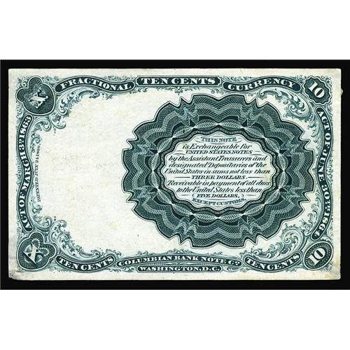 <B>10¢ Fifth Issue Proof Choice New.</B></I> A Gem but for mounting remnants in the four corners, this India Paper Proof is off its card, but it retains its original embossing. Proofs and Specimens of Fifth Issue notes are very rare, and most show tears, skins and other damage. This is an exceptional example.