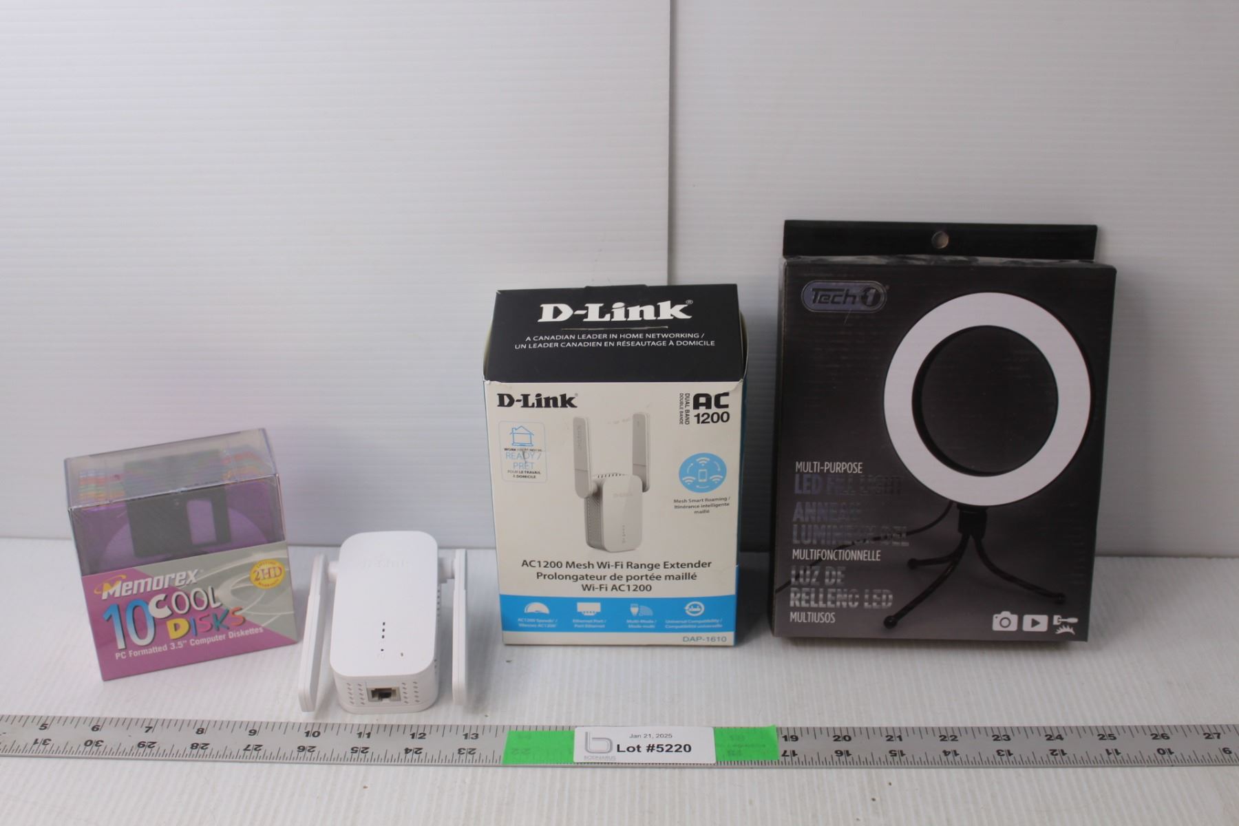 (10) Floppy Discs (Sealed), D-Link Wi-Fi Range Extender, LED Fill Light Approx. 7" Tall NIB