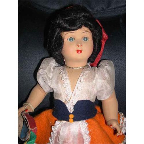 10" Foreign Made International Doll. She is sold as is as some of the trim on the edge of her dress needs stitching. One tiny speck of paint is off hand and sometimes her eyes need help in getting to open. If you shake the head they will open so you need to leave her standing on your shelf with open eyes. Doll has moveable head, arms, and legs. Doll comes from a smoke free environment. Buyer to pay $10 for shipping, handling, and insurance. Thanks for viewing.