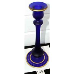 10" Frosted cobalt candlestick with gold rings on rim of nozzle and base with elegant trumpet shaped stem. No damage, but base is not frosted on outer rim.