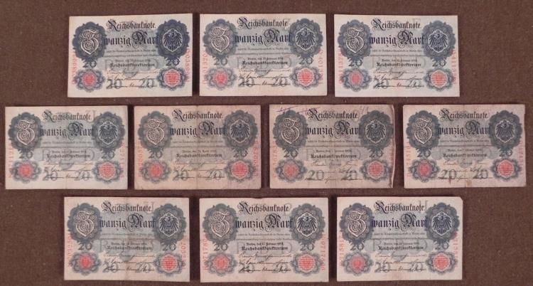 TEN GERMAN 20 REICHSMARKS BANK NOTES-EARLY 1900'S * * *