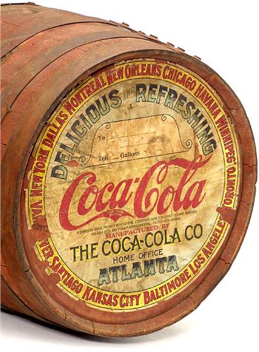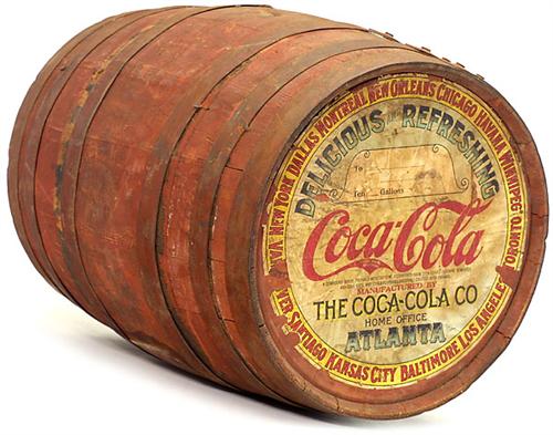 10-Gallon Wooden Barrel by "Coca-Cola", c. 1915 Original American wooden barrel for "Coca-Cola" syrop, with label on front side, Ø 131/2 in. - Very decorative!<Br>