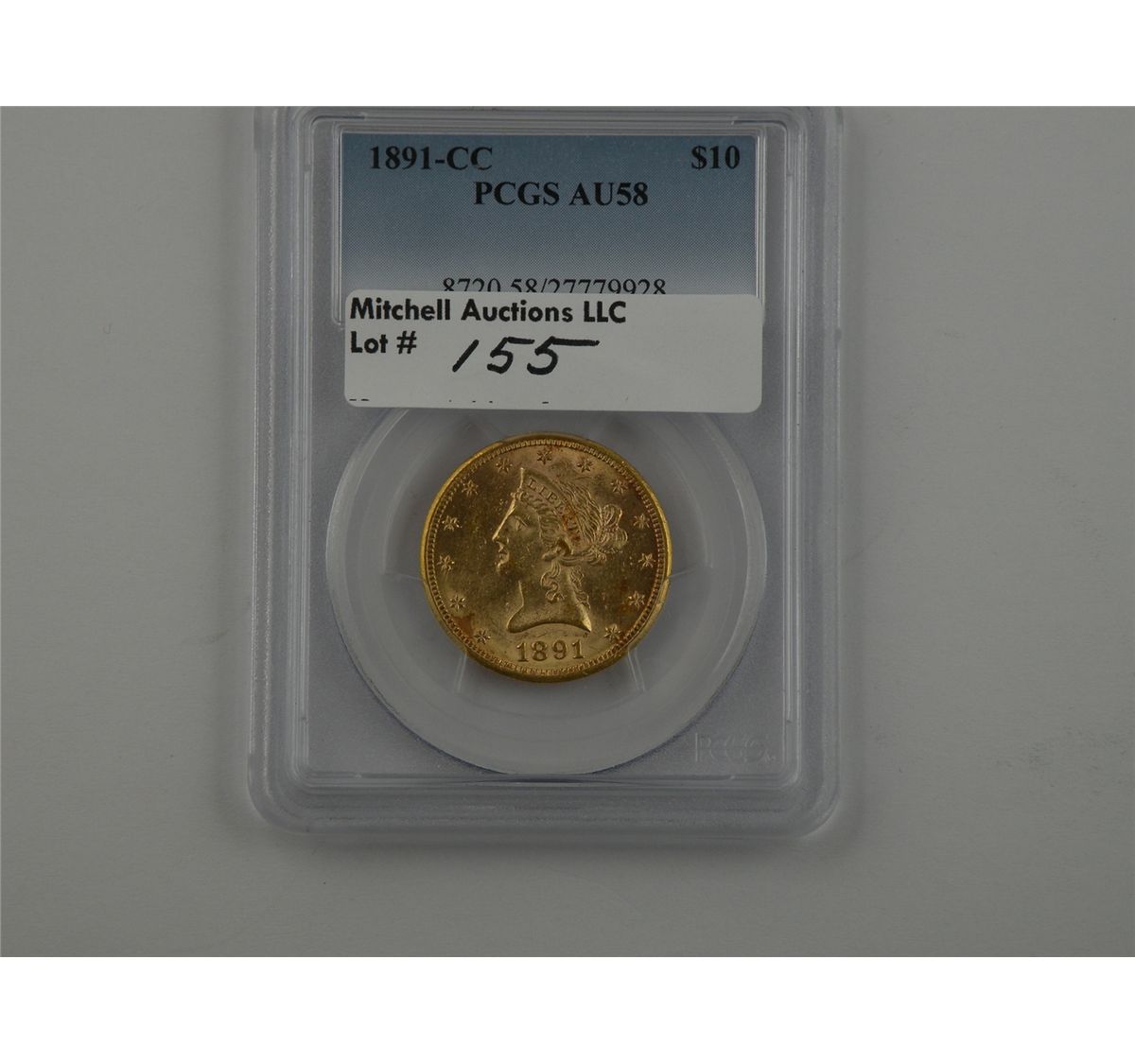 $10 Gold 1891-CC PCGS AU58. A balanced, frosty, nearly mint state example of this scarce Carson City issue. Est.$1600