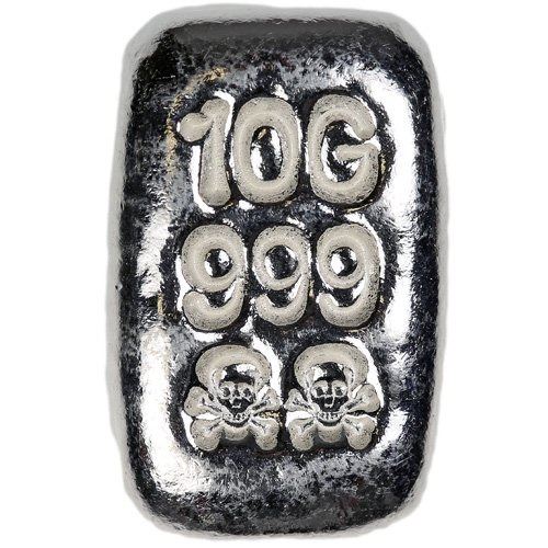 Contains 10 Grams (.3215 Troy oz) of .999 pure silver.Obverse features the only engravings.Popular skull and crossbones used on obverse.Privately minted in the United States.