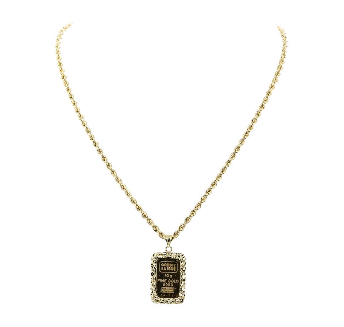 One swiss credit pendant with an attached 20 inch 3.7mm rope chain featuring: one 24KT swiss credit weighing 10 grams and 14KT yellow gold weighing 28 grams.